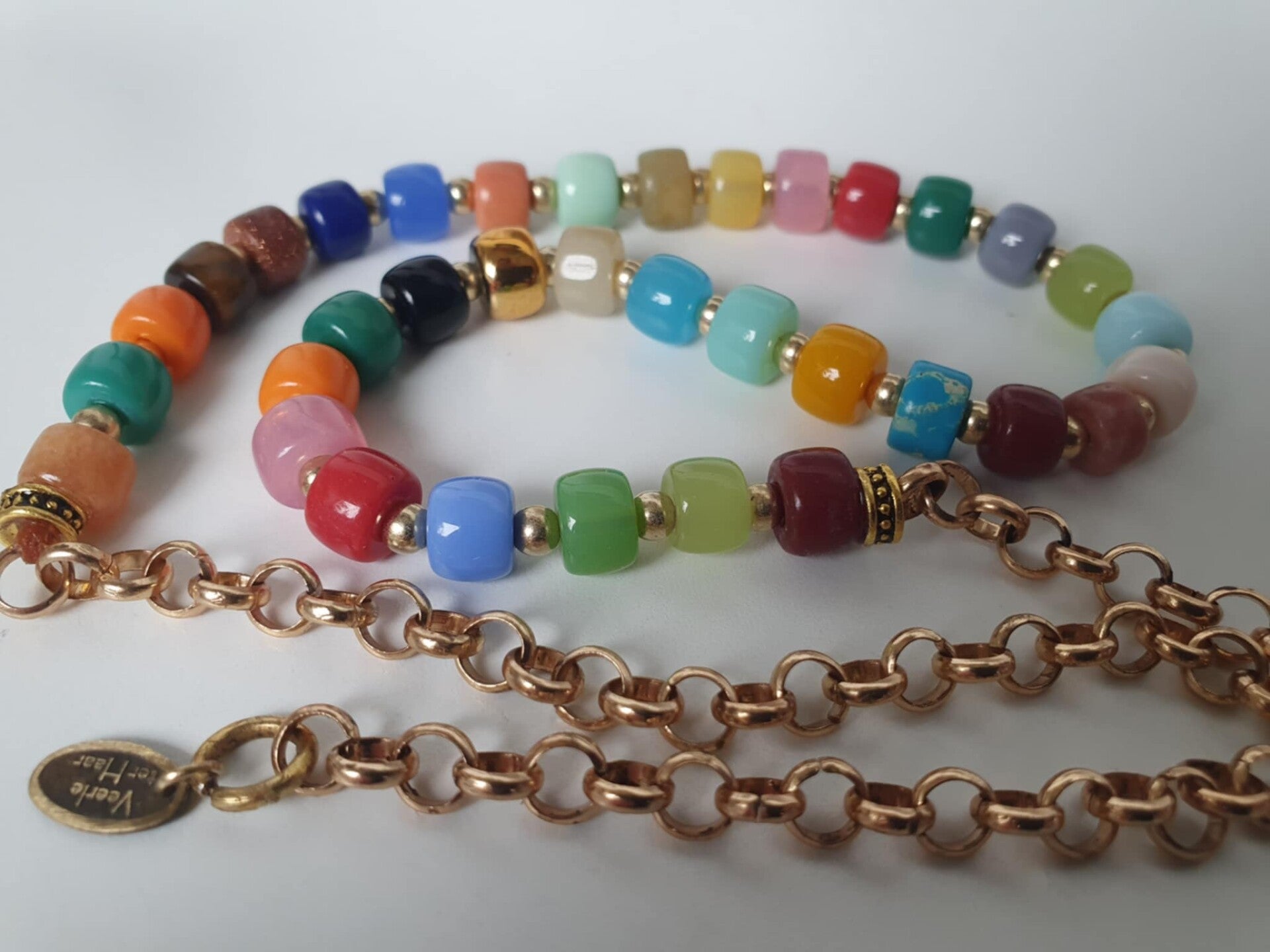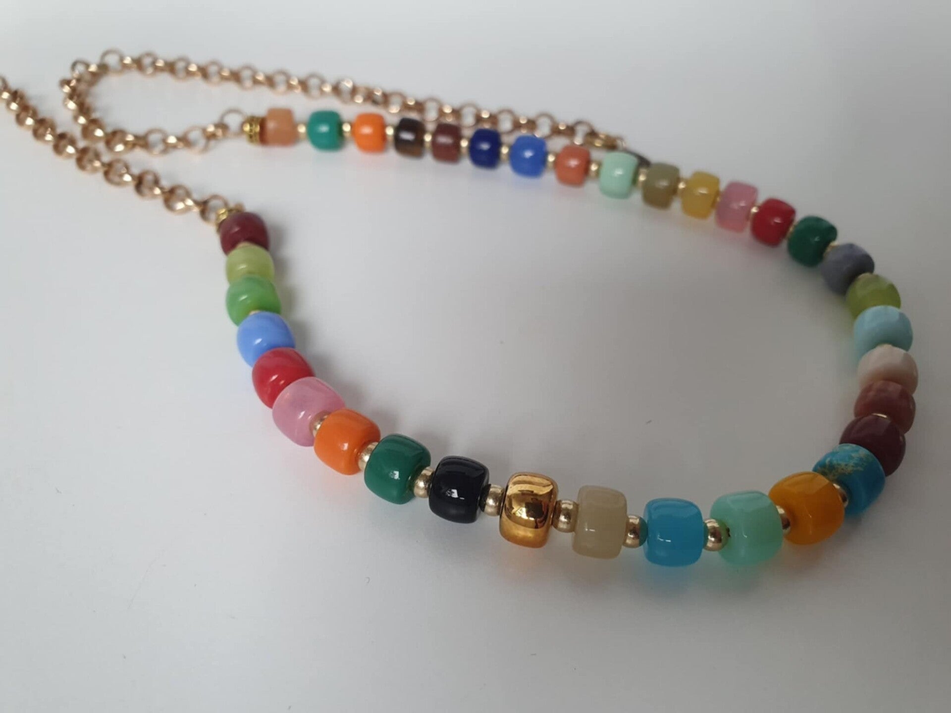 Gekleurde glas en stenen kralenketting met verstelbare goudkleurige metalen ketting. Let op de ketting komt in twee maten!