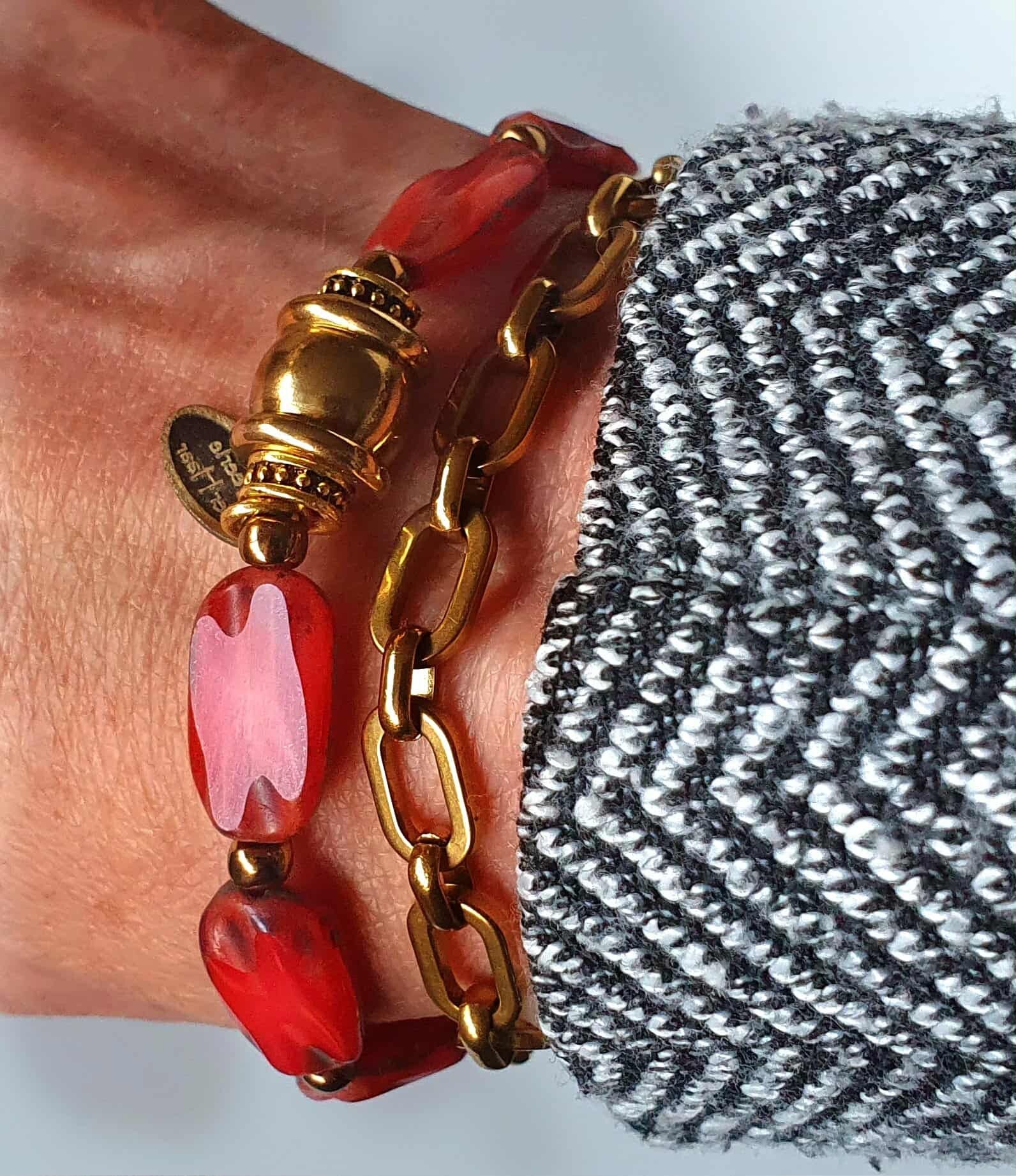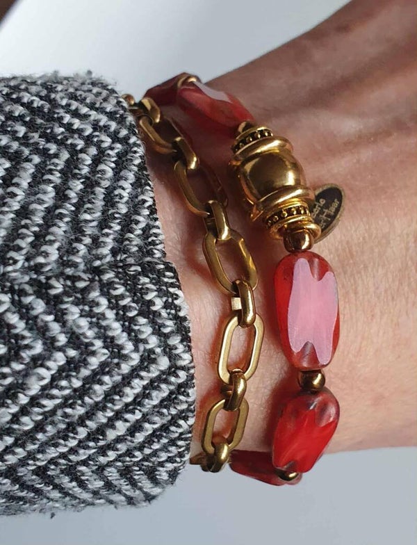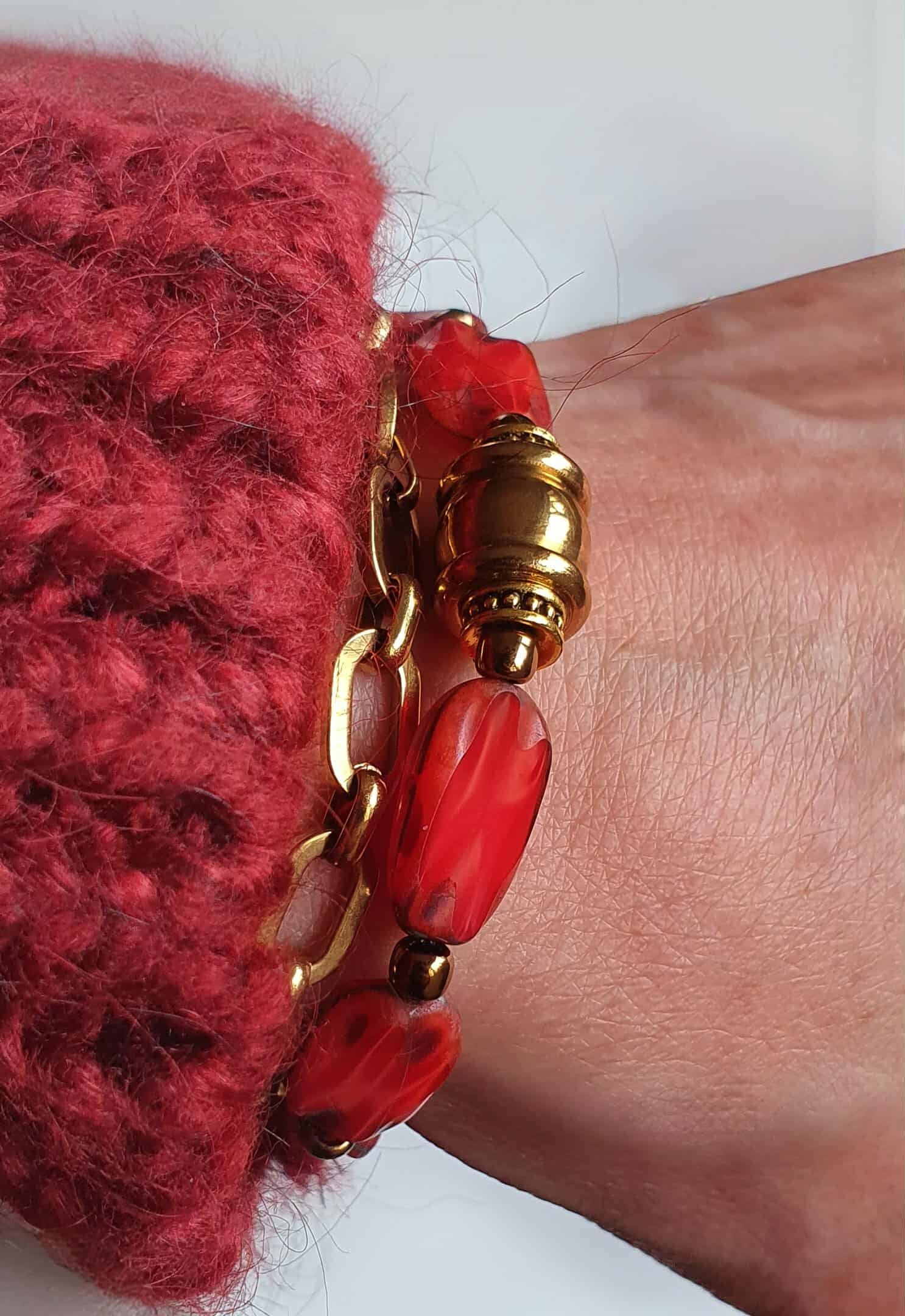 Beautiful travertin table cut czech glass bracelet. Lovely warm color red